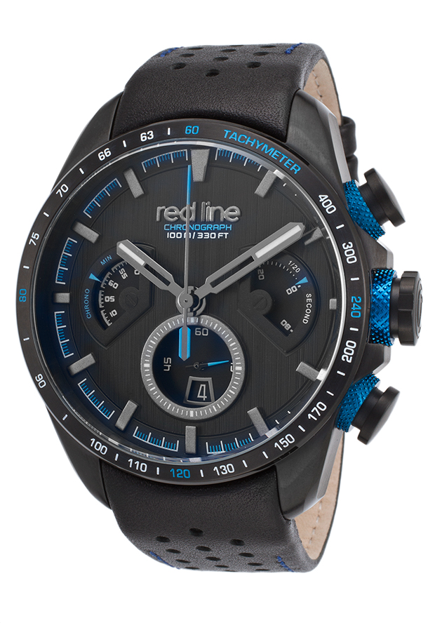 Pace-setting dimension for today's man from the new Red Line Kickdown collection. This ultra-bold and virile chronograph is pure exhilaration on the wrist with a strapping 48mm stain finished case presented on a handsome leather strap with distinctive pierced detail. The polished tachymeter bezel surrounds the attractive dial with luminous hands, polished hour markers and recessed disc subdials, including the captivating 1/20th of a second spinning-wheel subdial.